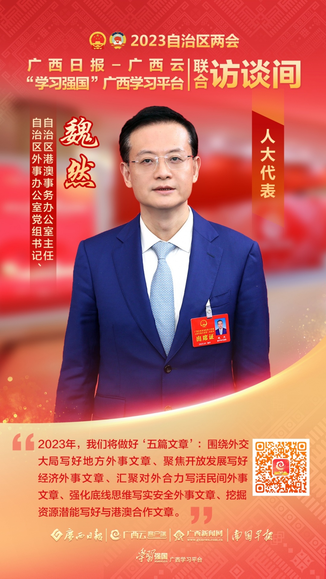 1月15日,自治区两会“广西云x‘学习强国’广西学习平台联合访谈间”迎来做客人大代表:自治区外事办公室党组书记、自治区港澳事务办公室主任魏然,围绕近年来广西外事工作取得的成效等相关话题接受采访。