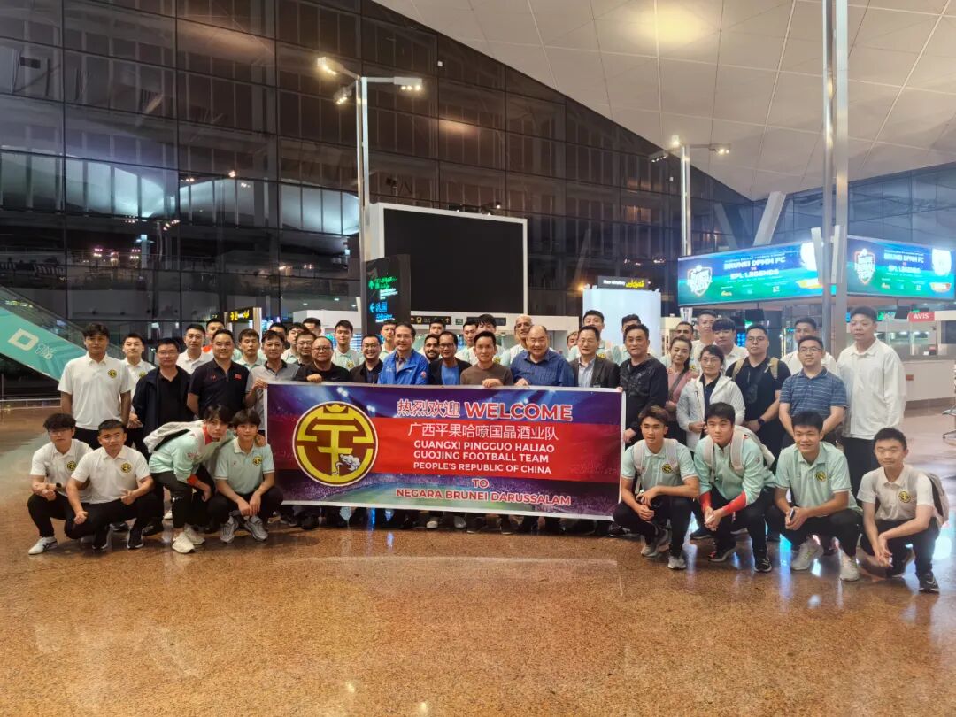 4月18日凌晨,应文莱足球协会邀请,由广西壮族自治区外事办公室牵头,广西壮族自治区体育局、平果市负责人率队,广西平果哈嘹国晶足球队代表团抵达文莱,在机场受到文莱皇太子足球俱乐部彭基兰萨利赫、林汉璋等董事会热烈欢迎。中国驻文莱使馆参赞王海涛到机场迎接。