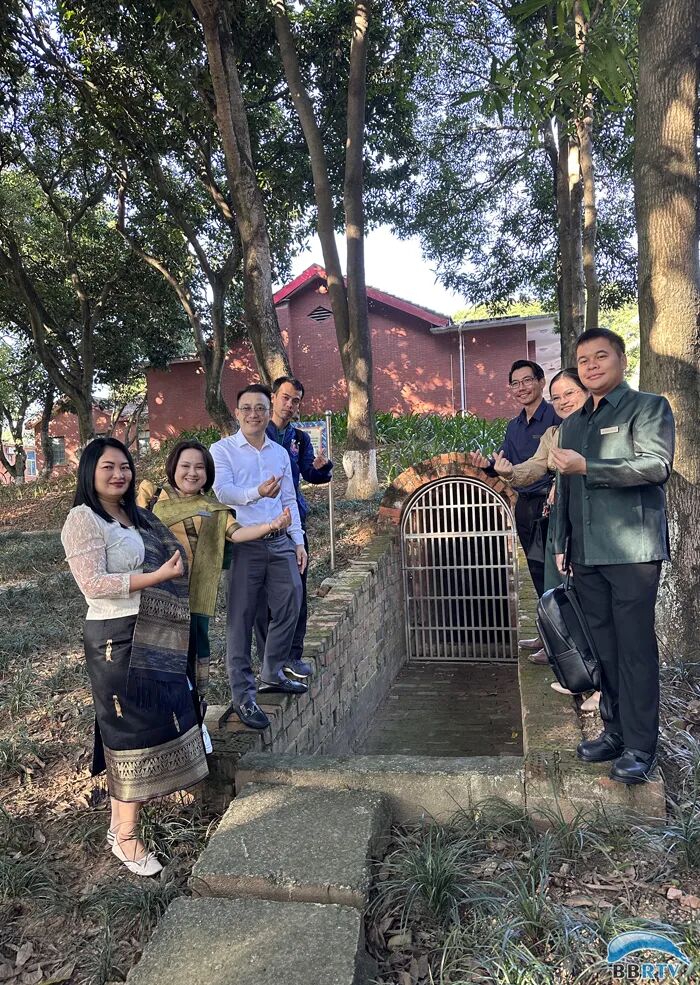 老挝“六七”学校校友及子女友好访问团参观“六七”学校旧址。