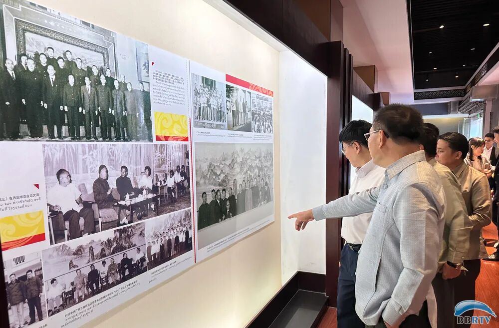 老挝“六七”学校校友及子女友好访问团参观“六七”学校陈列室。