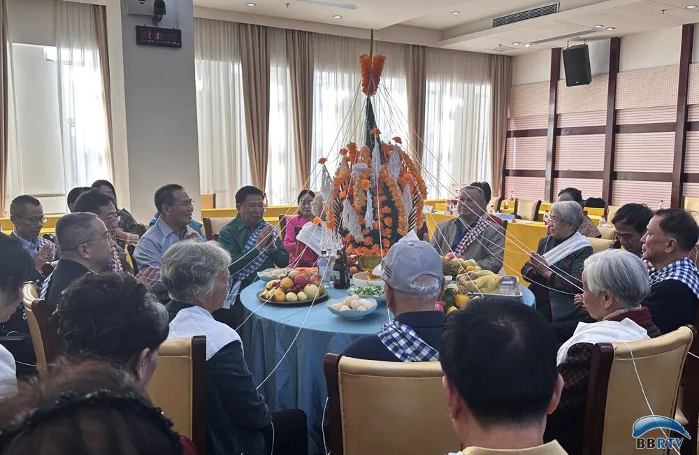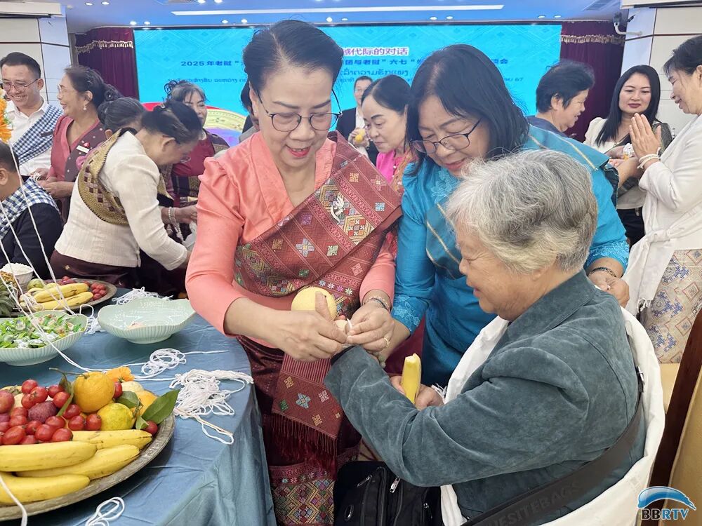 座谈会上举行老挝传统拴线仪式,祈求平安幸福。