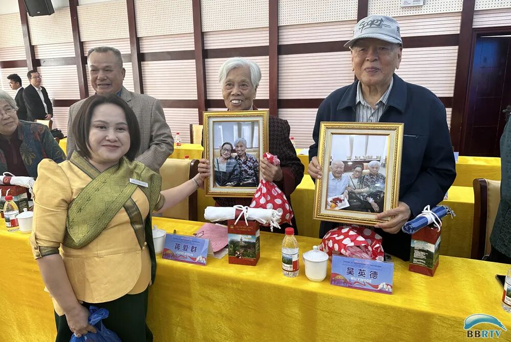 老挝“六七”学校校友及子女友好访问团成员向“六七”学校原中方教职工赠送纪念品。