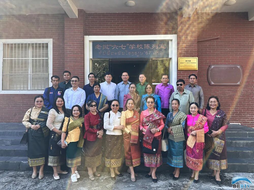 老挝“六七”学校校友及子女友好访问团在“六七”学校陈列室合影留念。