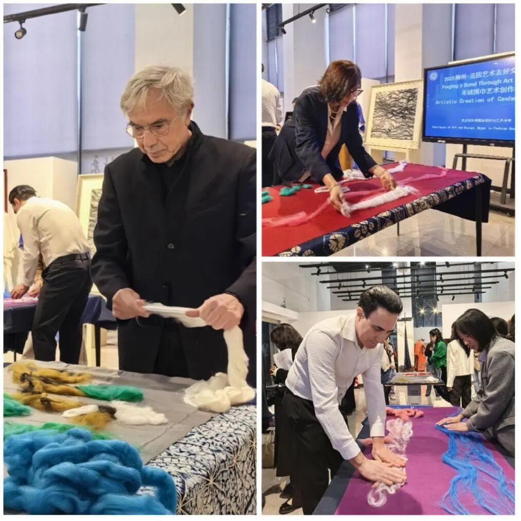 活动在柳州市第二职业技术学校非遗博物馆以实践创作拉开序幕,与会嘉宾和学校师生共同创作羊毛纤维画围巾。法国艺术家对这种兼具材质美感与表现力的艺术形式表现出浓厚兴趣,双方在创作过程中自然交流技法与理念,手指间的协作成为跨越语言的沟通。