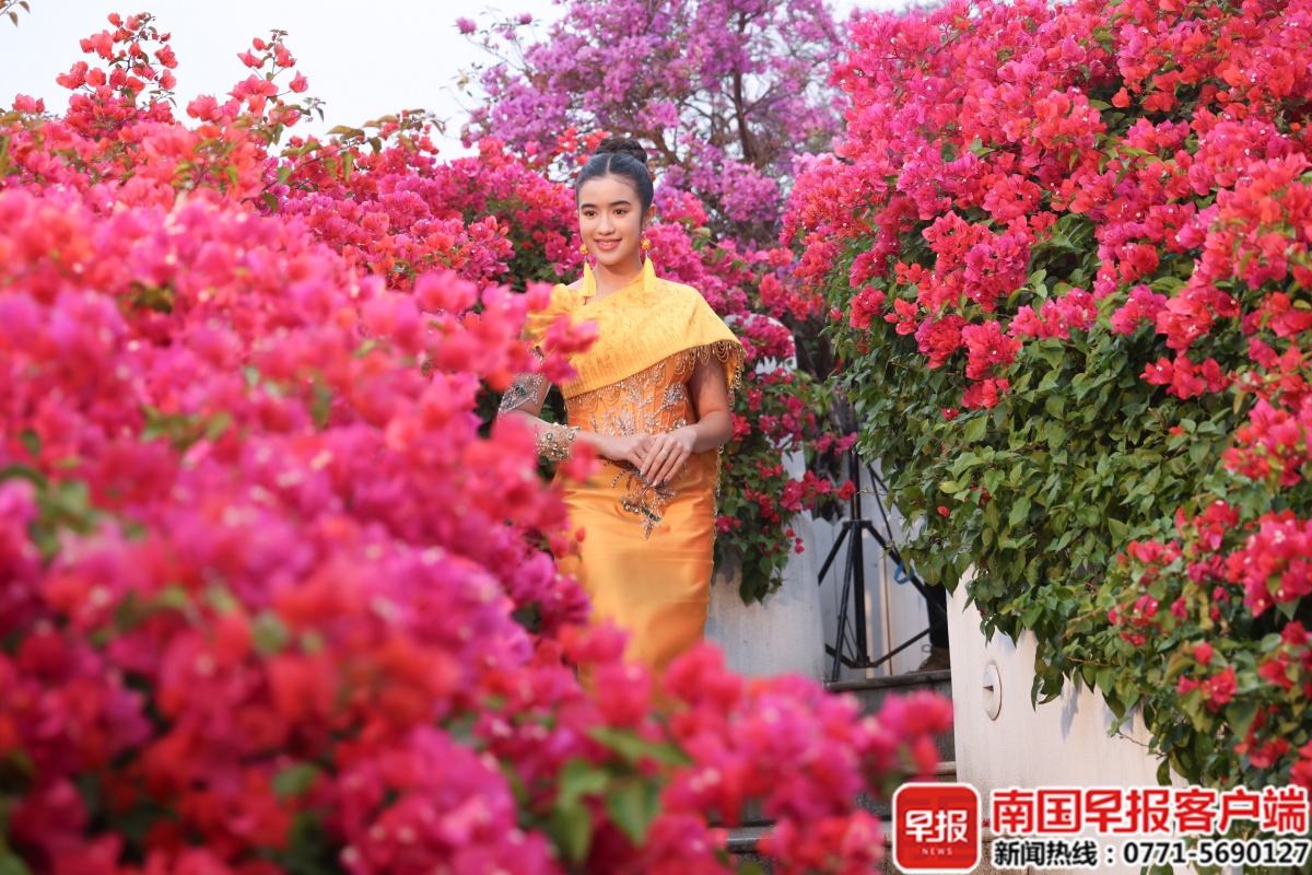 上午,这位柬埔寨公主身着柬埔寨传统服饰,佩戴同色系广西壮族绣球耳饰,将两国文化元素自然融合,造型别致吸睛。现场不少游客纷纷称赞她“歌声甜美,普通话十分标准”,其流利的中文表达也为交流增添了不少便利。