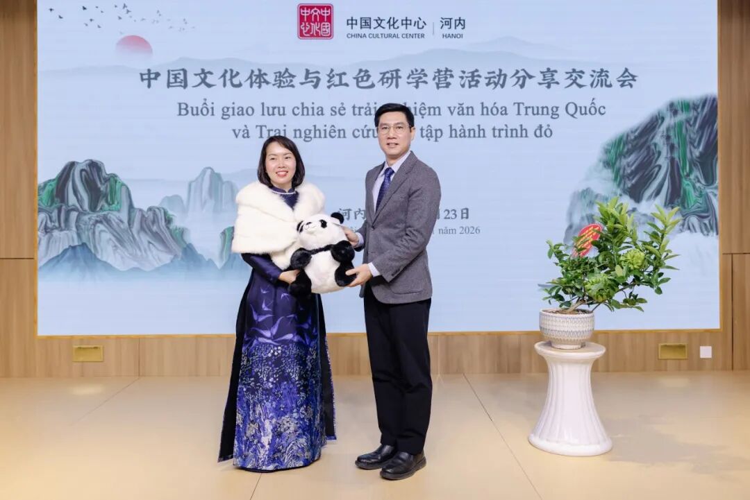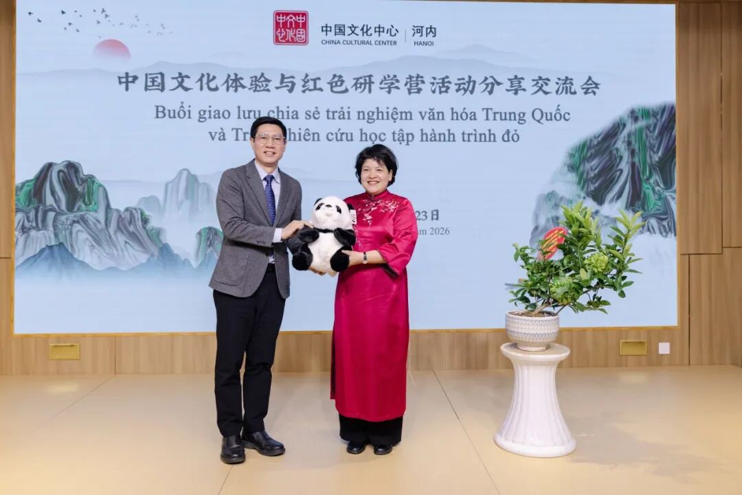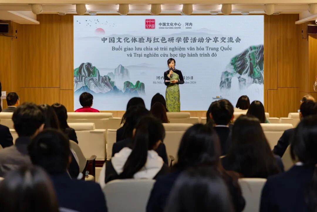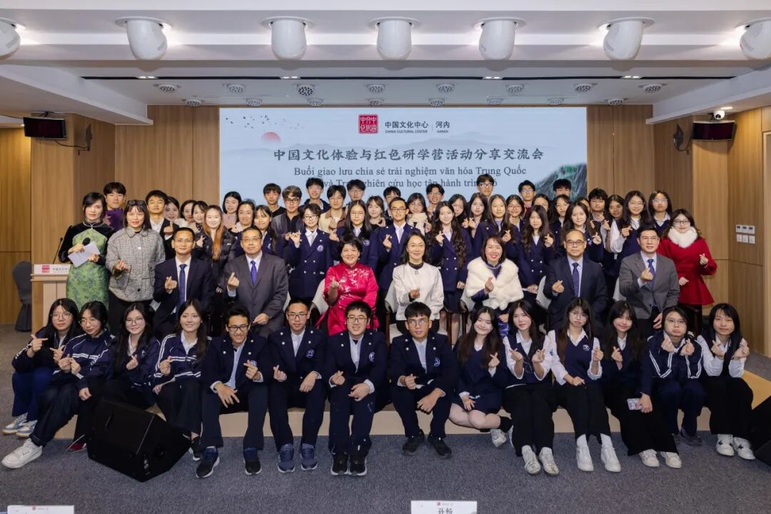 1月23日下午,在中国驻越南大使馆的指导与支持下,“中国文化体验与红色研学营活动”分享交流会在河内中国文化中心成功举行。中国驻越南大使夫人孙畅,中国驻越南大使馆参赞邢久强、参赞罗耀光、一秘王廷冠,河内中国文化中心主任张德山,河内—阿姆斯特丹重点中学校长陈垂阳、河内国家大学下属外国语大学附中副校长杜氏玉枝,以及来自河内两所重点中学的师生代表,与复旦大学、北京外国语大学、广东外语外贸大学、四川外国语大学及河内大学的中国留学生近百人共同出席活动。