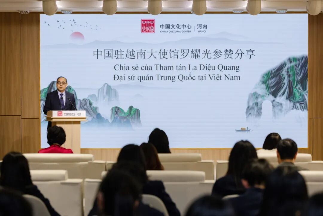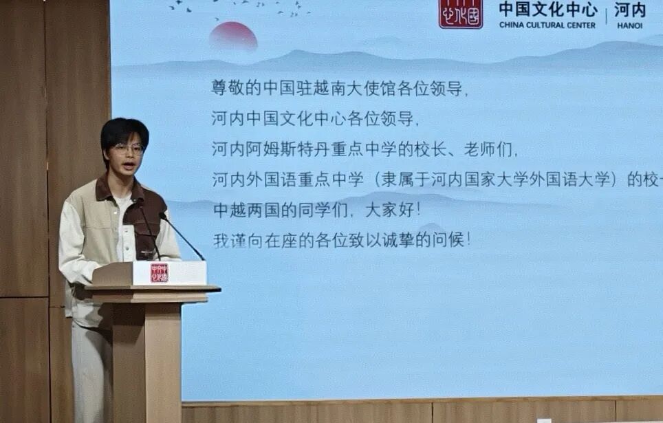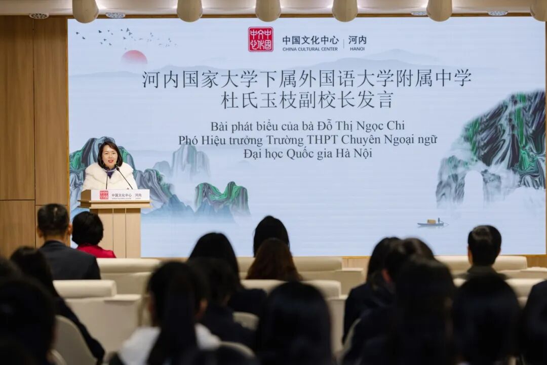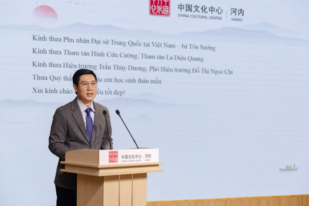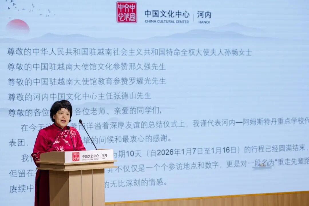 1月23日下午,在中国驻越南大使馆的指导与支持下,“中国文化体验与红色研学营活动”分享交流会在河内中国文化中心成功举行。中国驻越南大使夫人孙畅,中国驻越南大使馆参赞邢久强、参赞罗耀光、一秘王廷冠,河内中国文化中心主任张德山,河内—阿姆斯特丹重点中学校长陈垂阳、河内国家大学下属外国语大学附中副校长杜氏玉枝,以及来自河内两所重点中学的师生代表,与复旦大学、北京外国语大学、广东外语外贸大学、四川外国语大学及河内大学的中国留学生近百人共同出席活动。