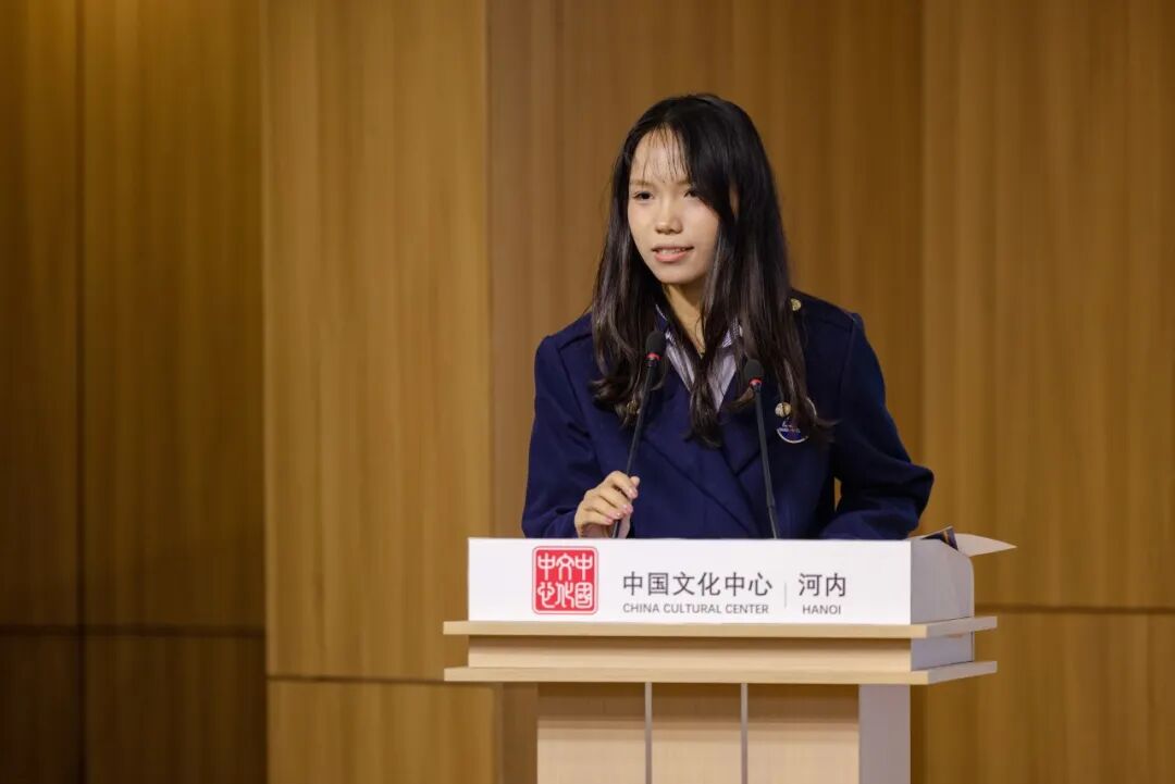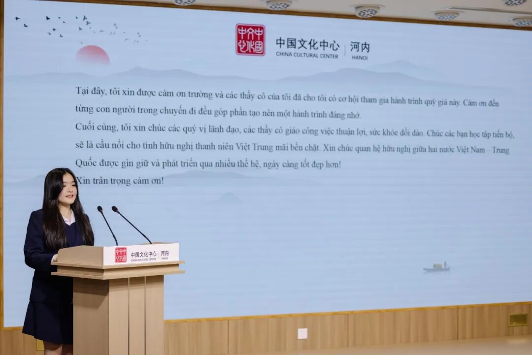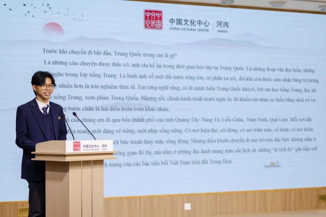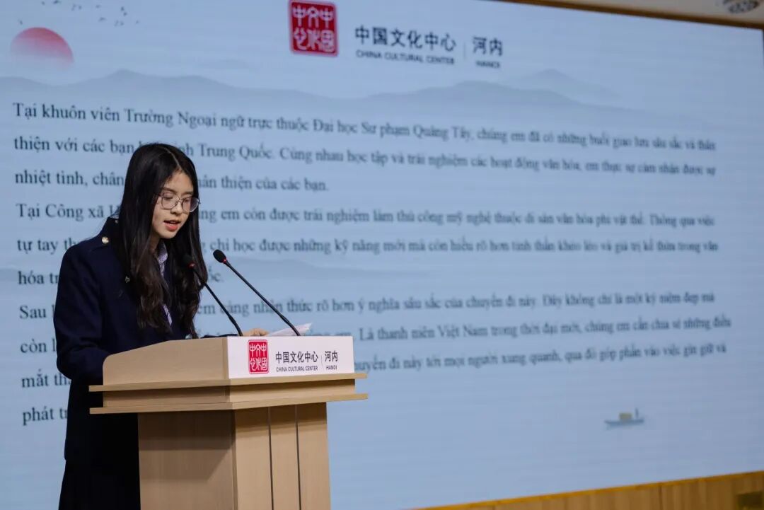 在分享环节中,5位中越青年学生代表围绕“中越传统友谊”与“青年责任担当”等两大主题展开分享。尤为动人的是,4位越南学生均以流利中文分享感悟,而中国留学生代表则以娴熟越语畅叙心声。他们以邻国的语言为载体,从历史回响、文化互鉴、责任使命与未来愿景等多维视角,传递出超越地域的共情与共识,让在场每一位听众为之动容。