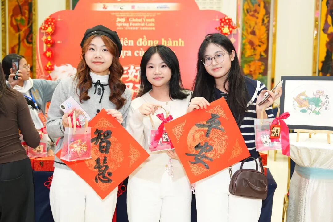 当晚,越南河内银河剧院内张灯结彩、笑语盈堂,处处洋溢着新春的喜庆与暖意。入口处设置的“爱(AI)上非遗市集”吸引观众纷纷驻足打卡。书法写“福”、非遗“点米成画”、AI穿越拍照等互动区域前排起长队,观众在手作与互动中亲身感受两国文化的相融相通,沉浸于浓浓的年俗趣味之中。“这个‘福’字写得真传神!”一位越南青年举着墨迹未干的春联笑言。灵动可爱的AI数智人“福宝”穿梭人群中,与观众击掌合影,欢声笑语此起彼伏。祝福墙上贴满写有中越双语的卡片:“愿友谊长存”“新年快乐,万事如意”,字字句句皆流淌着真挚的情谊。