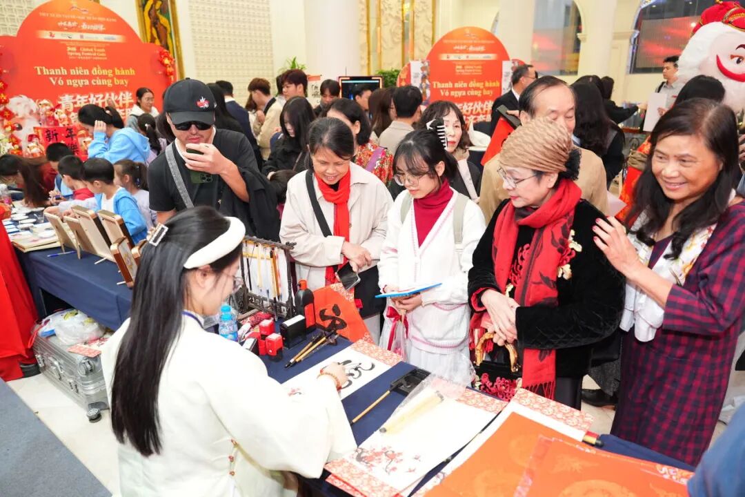 开场歌舞《AI上春天·飞跃山海》由两国青年演员共同演绎,舞姿翩跹如春风拂柳,歌声清越似溪流穿谷,瞬间将观众带入一个跨越国界的春日梦境。随后,中越器乐合奏《环游越南》以越南传统新春乐曲为旋律基底,独弦琴的幽远、竹笛的清脆、古筝的典雅与二胡的缠绵交织共鸣,演奏间,中越书法家同台挥毫,笔走龙蛇间,中越双语书写的“马到成功”即跃然纸上,墨香氤氲中传递着对新岁最美好的祈愿。在主持人引导下,全场观众齐声诵读,声浪如潮,将气氛推向高潮。歌曲《你来我往有情缘》由中国歌手刘海旋与越南歌手杜氏清花深情对唱,“山相依、水相连”的歌词如清泉沁心,唱出两国山水相连、心意相通的深厚情谊,引得不少观众轻轻跟唱。