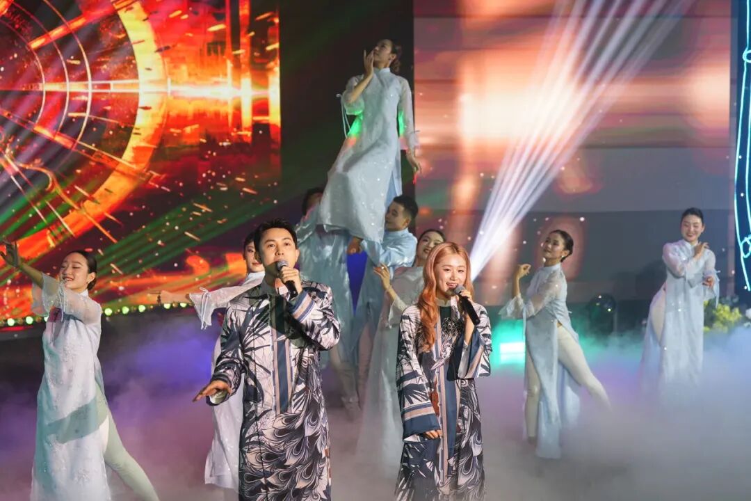 晚会由中越双方主持人共同主持。在一段充满科技感的视觉呈现中,数智人“福宝”穿越“数据山海”翩然登场,以未来感十足的方式拉开了晚会序幕。整场演出以“山水相连·共叙情缘”为主线,十二个节目层层递进,宛如一幅流动的文化长卷,铺展出中越艺术交融的生机与魅力。