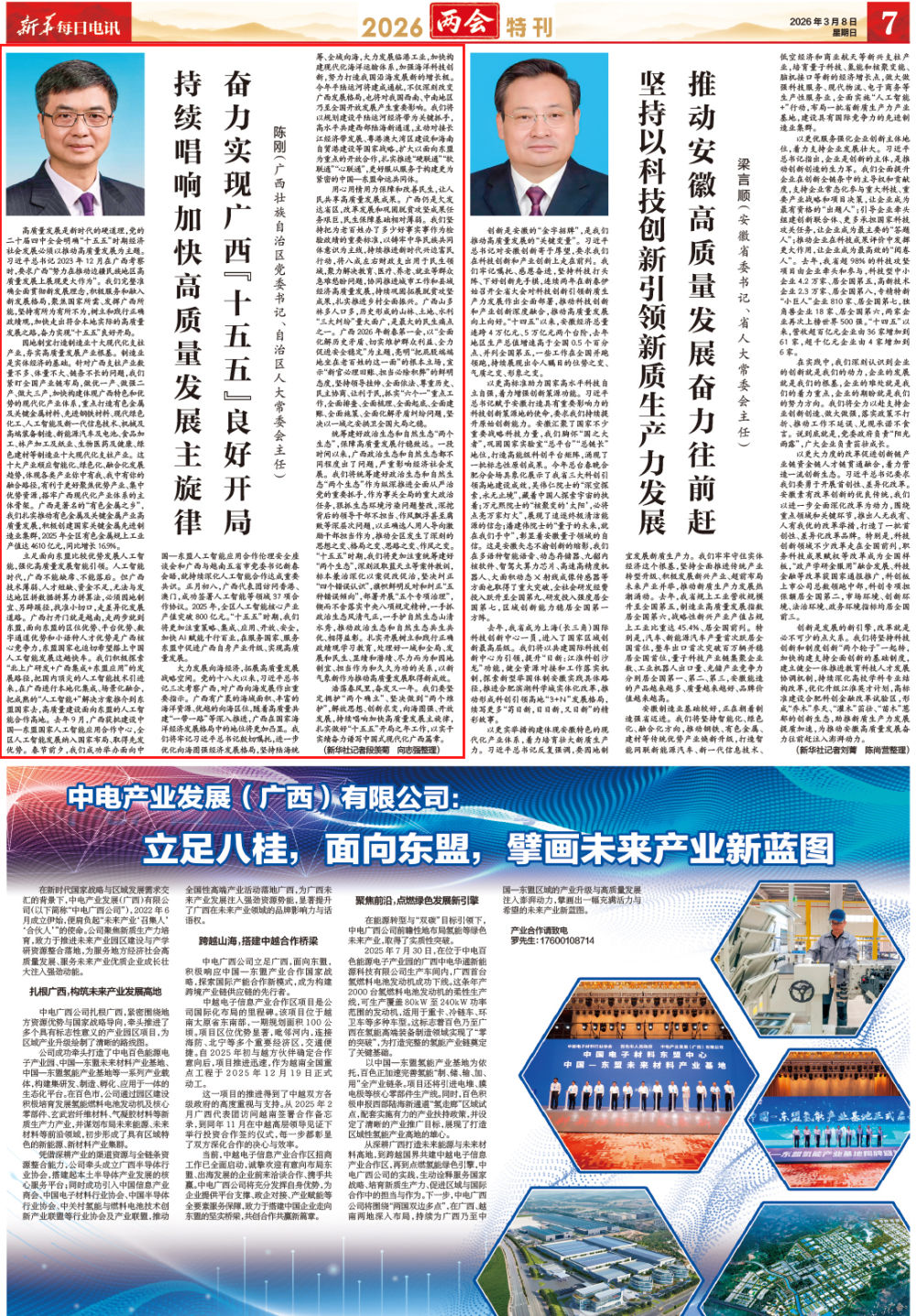 3月8日,《新华每日电讯》第7版刊发广西壮族自治区党委书记、自治区人大常委会主任陈刚署名文章《持续唱响加快高质量发展主旋律 奋力实现广西“十五五”良好开局》,全文如下——