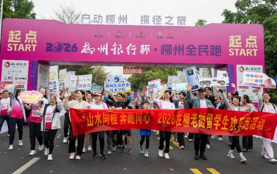 3月28日上午,2026柳州全民跑鸣枪开跑。一支由40名在柳老挝留学生组成的队伍格外引人注目——他们身着老挝传统服饰,手持“澜沧号”动车组、“东风柳汽”新能源重卡等造型板,与众多跑者一同奔跑在柳江之畔。
