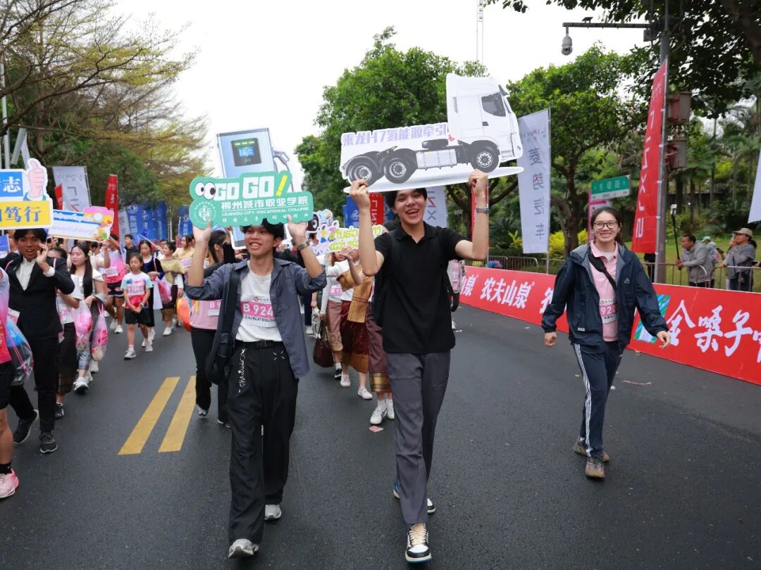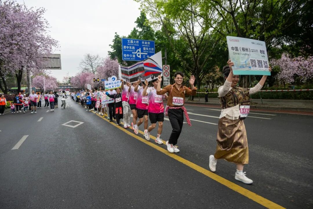 随着发令枪响,方阵有序出发。柳铁职院的留学生们用造型板连成一列“澜沧号”动车组——这正是飞驰在“中老铁路”上的车型之一。周围的跑友被这份欢乐感染,纷纷肩搭着肩接在队伍后面,一列“动车”越拉越长,载着中老两国友人向前奔跑。