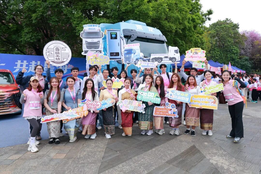 不远处,城职院的留学生们则排成一排,手持新能源卡车造型板,模拟“充能”后击掌向前奔跑,用最直观的方式表达对绿色未来的期待。