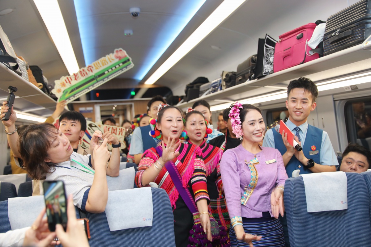 列车飞驰在中老铁路上,旅客与乘务员载歌载舞。