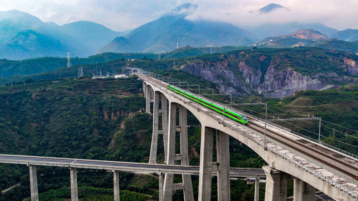 中老铁路国际旅客列车在高架桥上穿行。