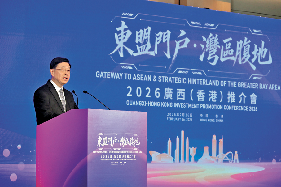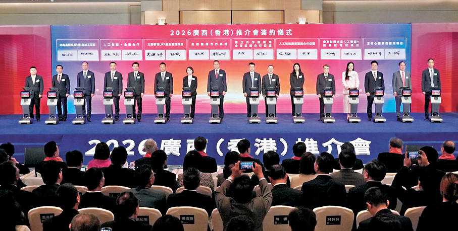 「東盟門戶·灣區腹地─2026廣西(香港)推介會」昨日在港舉行,桂港兩地共簽署24個合作協議,當中包括由兩地政府簽署的兩份分別涵蓋人工智能、青年交流的合作文件。香港特區行政長官李家超致辭時表示,期望桂港兩地一同發揮優勢,持續拓展合作空間,進一步深化各領域合作,優勢互補,互利共贏,共同為國家高質量發展貢獻更大力量。他並歡迎希望到境外發展的廣西企業,充分利用香港平台,攜手進一步拓展海外市場,挖掘更多全球商機。廣西壯族自治區黨委書記、自治區人大常委會主任陳剛表示,期盼雙方共同深化現代化產業合作,共建跨境產業鏈,共促金融與服務互通。