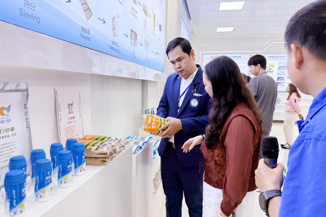 泰国记者协会副主席查姆南·差亚颂在崇左东亚糖业有限公司了解产品情况。