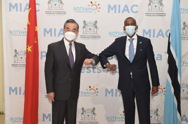 当地时间2021年1月7日,国务委员兼外长王毅在哈博罗内同博茨瓦纳外长夸佩举行会谈。