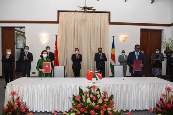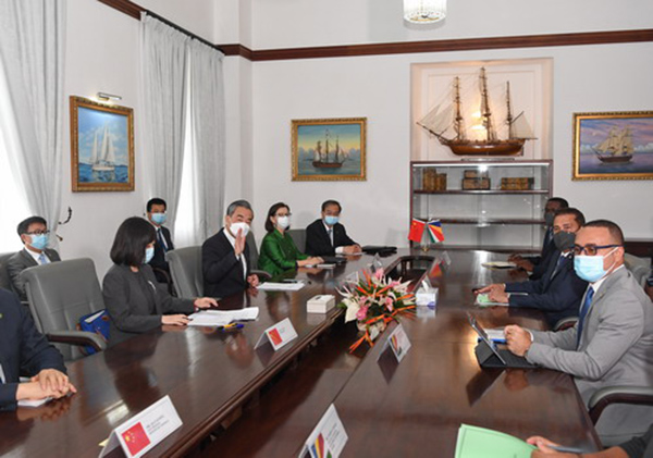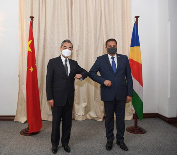 当地时间2021年1月9日,国务委员兼外长王毅在维多利亚同塞舌尔外交部长拉德贡德举行会谈。