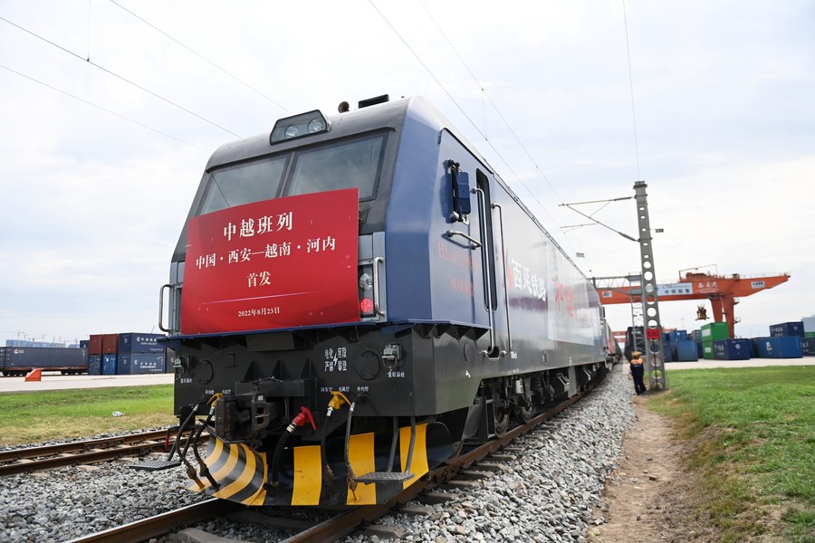 A China-Vietnam freight train pulls out of Xi'an international port in Xi'an, northwest China's Shaanxi Province, Aug. 23, 2022. (Xinhua/Li Yibo)