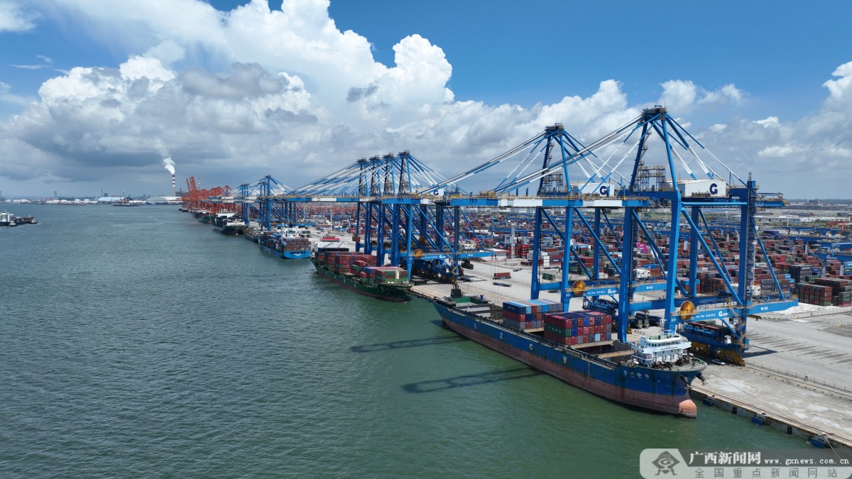 在广西钦州北部湾港自动化集装箱码头,货轮在有序卸下集装箱货物。何家海 摄