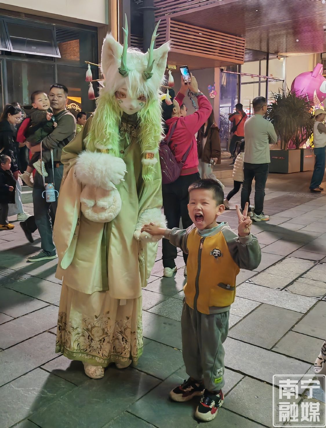 一名儿童高兴地与Cosplay表演者合影。记者 韩沛 摄