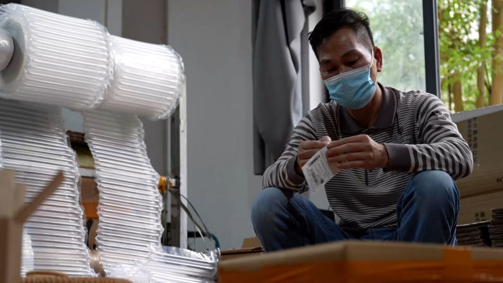 在中越边境广西东兴市电商小镇的仓库内,主播正穿梭在一排排的货架间,充满热情地为网友进行讲解。箱包、餐盘、果篮、花瓶……款式精美的各式产品在货架上整齐摆放着,它们基本都产自越南。
