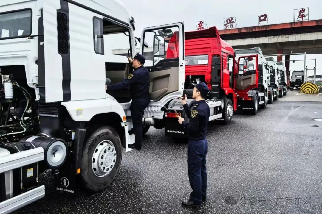 东兴海关关员正在对从东兴口岸北仑河二桥出口的50多辆国产货车整车开展登临检查。何璐璐 摄