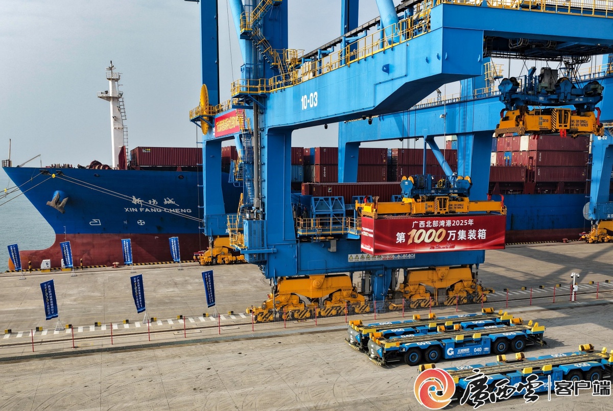 当日上午,北部湾港集装箱整齐排列,货轮和班列整装待发。韦韬通过视频连线钦州港和钦州铁路集装箱中心站,宣布广西北部湾港第1000万标箱起吊、第100条集装箱航线启航、第10218列海铁联运班列发车。汽笛长鸣声中,集装箱被平稳吊装到“新防城”轮上,柬埔寨贡布航线船舶驶向深蓝海域,西部陆海新通道海铁联运班列从钦州铁路集装箱中心站缓缓驶出。