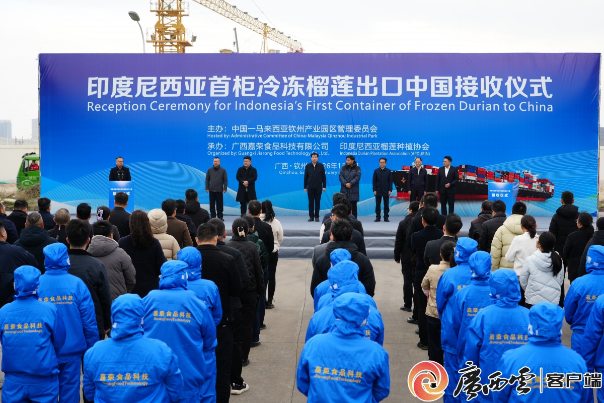 1月6日,印度尼西亚首柜冷冻榴莲出口中国接收仪式在钦州市举行,标志着通过海运输华的印尼冷冻榴莲正式直接进入中国市场。