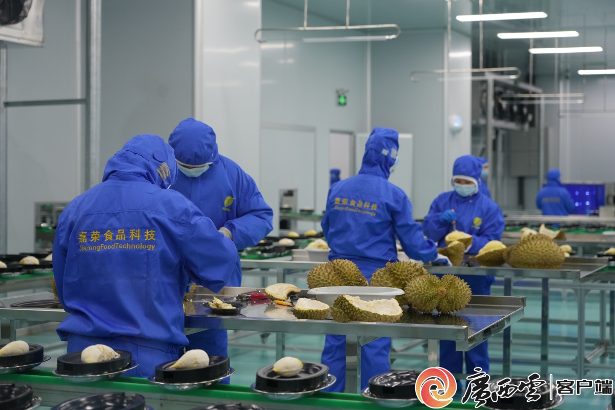 “此柜冷冻榴莲进入生产车间后,将生产成带壳切片榴莲、冷冻榴莲肉、榴莲冻干及榴莲泥等多类深加工产品。”广西嘉荣食品科技有限公司总经理吴俊逸介绍,公司已建成国内首个榴莲全产业链智能化工厂,通过集成全球领先的AI高光谱智能糖选、-195℃液氮急速冷冻及FD冻干等技术,实现对榴莲糖度、成熟度的无损精准检测和对榴莲品质的标准化、可控化生产。