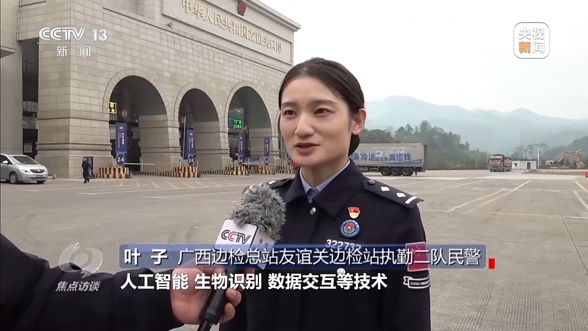 广西边检总站友谊关边检站执勤二队民警 叶子:我们整合了人工智能、生物识别、数据交互等技术,实现车辆和司机预先备案、自主采集、快速核验三步即可通关,让数据先跑、货车秒过成为现实。