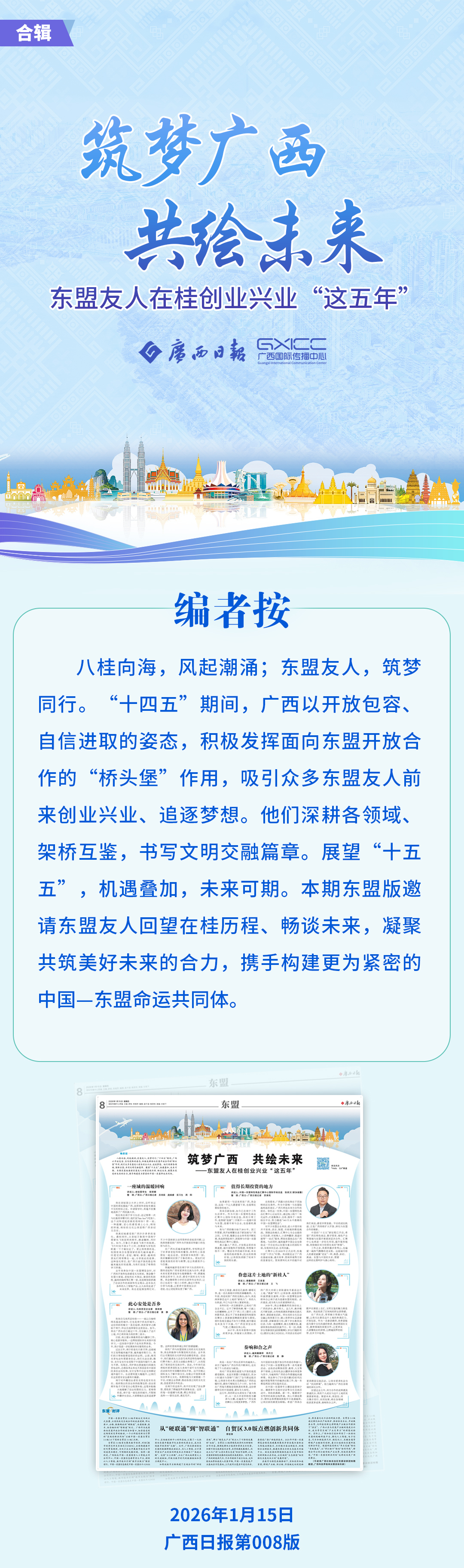 中国的“十五五”新征程已开启,希望广西在特色商品、数字贸易、绿色产业等领域与东盟开展更深层次合作。汇聚中心也将进一步优化布局,提升服务能级,持续做好双方经贸往来的“桥梁”。