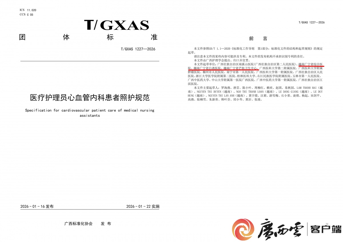 记者1月28日从自治区南溪山医院获悉,由该院牵头,联合越南广宁省综合医院等18家中外医疗机构共同起草的《医疗护理员骨科患者照护规范》与《医疗护理员心血管内科患者照护规范》两项团体标准,已通过广西标准化协会审查批准并正式发布实施,标志着中越两国在卫生健康领域标准化合作迈出重要一步。