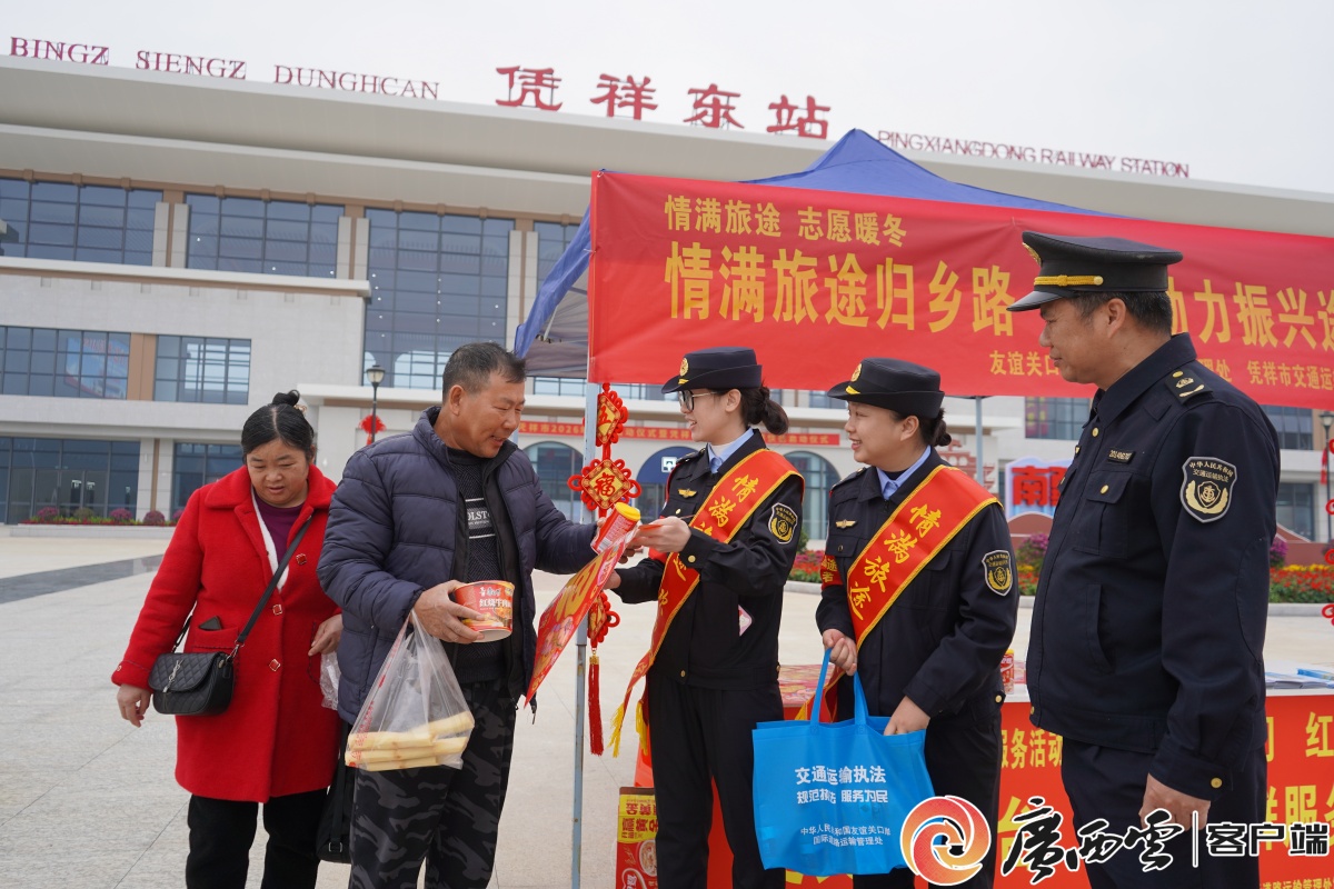 工作人员在凭祥东站向旅客发放便民物资。赵匡䶮 摄