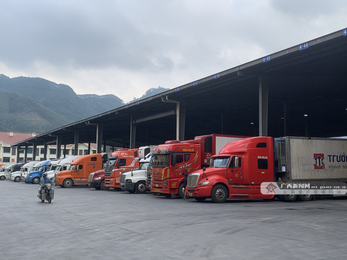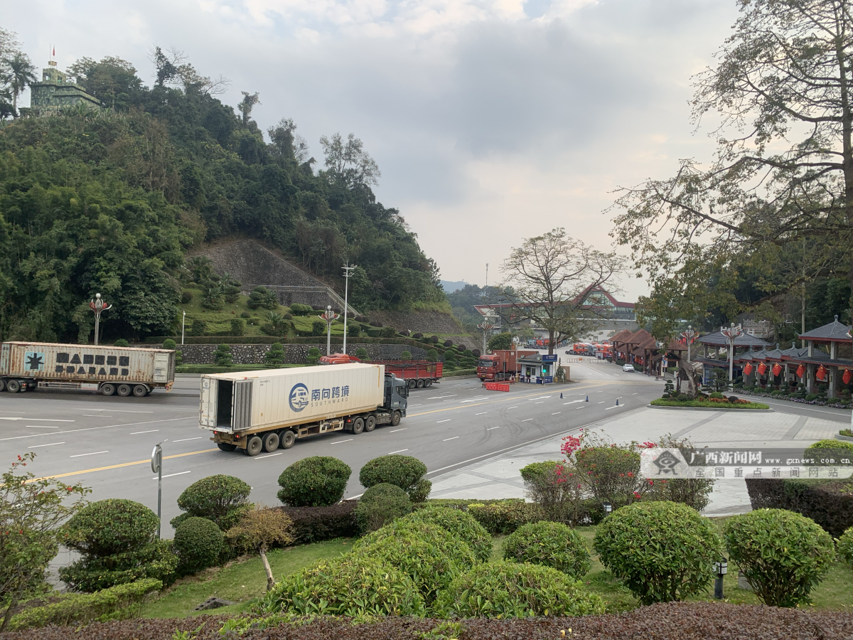 一辆辆卡车有序排队从凭祥友谊关口出入境。记者 管林华 摄