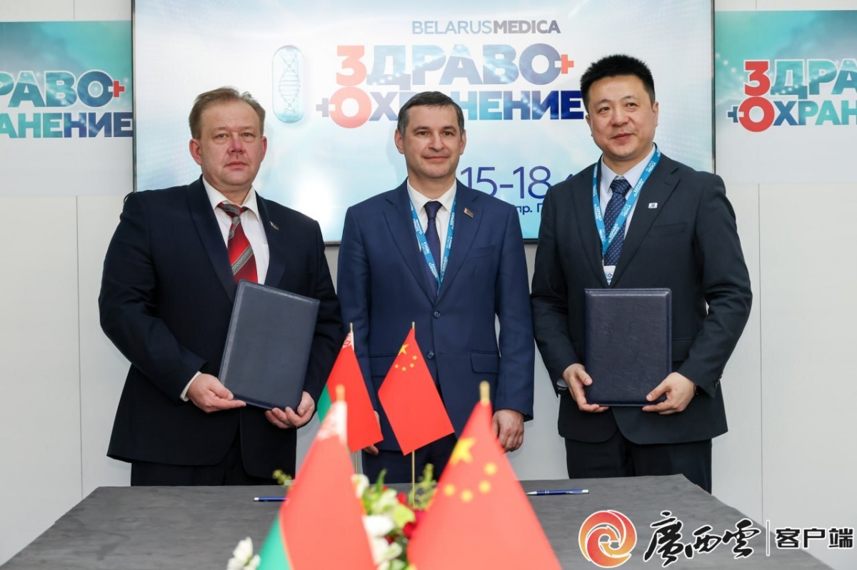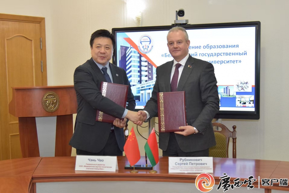白俄罗斯海虹医疗科技有限公司和白俄罗斯国立医科大学校长签署共建“中白数字医疗设备展示与培训中心”协议。白俄罗斯海虹医疗科技有限公司供图