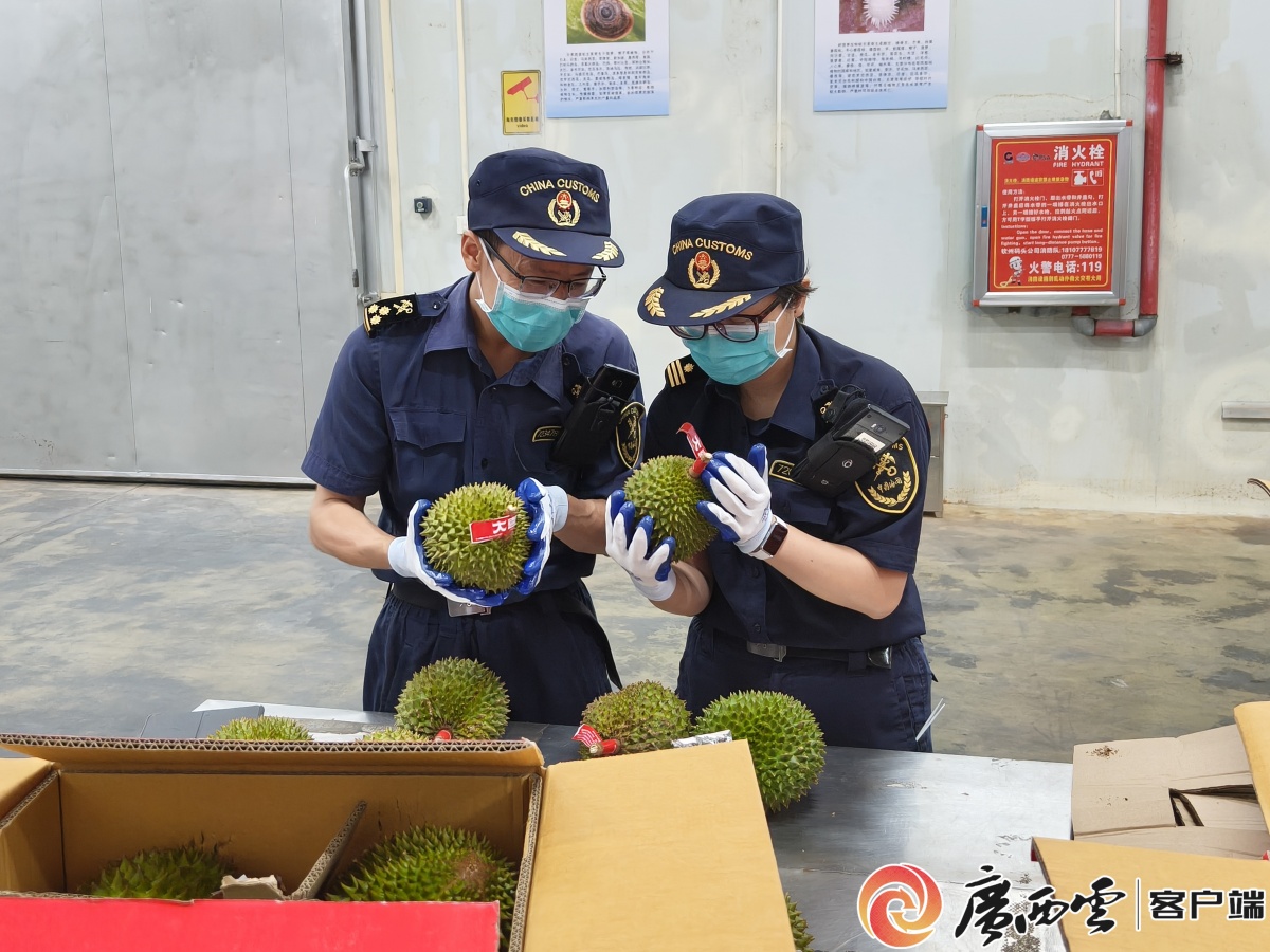 榴莲凭借丰富的营养成分和独特的风味,被誉为“水果之王”,一直深受国内消费者青睐。“恰逢三月三期间,鲜果的时效性就是竞争力,早一分钟抵达市场,就能多一分新鲜、多一份市场优势。”广西寰宇国际物流有限公司经理陈娟娟介绍,为保障榴莲新鲜度,公司提前向海关进行申报,货物到港后当天便完成全部通关流程,实现“即到即通”。她表示,当前各大水果进口商正陆续备战榴莲销售旺季,钦州港稳定高效的通关环境,为公司拓展新鲜水果进口业务注入了强劲信心,后续还有大批量泰国榴莲将通过钦州港口岸进口。
