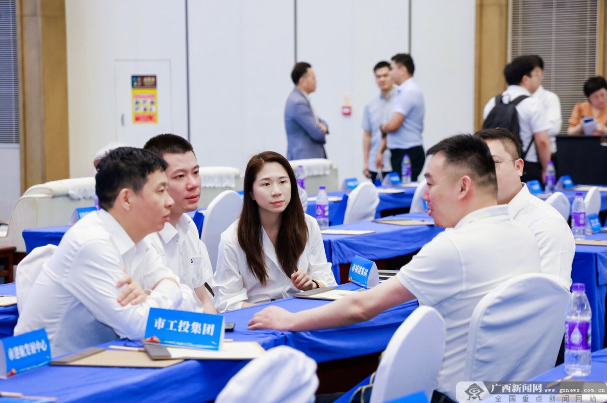 平陆运河(崇左)货源对接会上,参会企业代表正在对接洽谈。