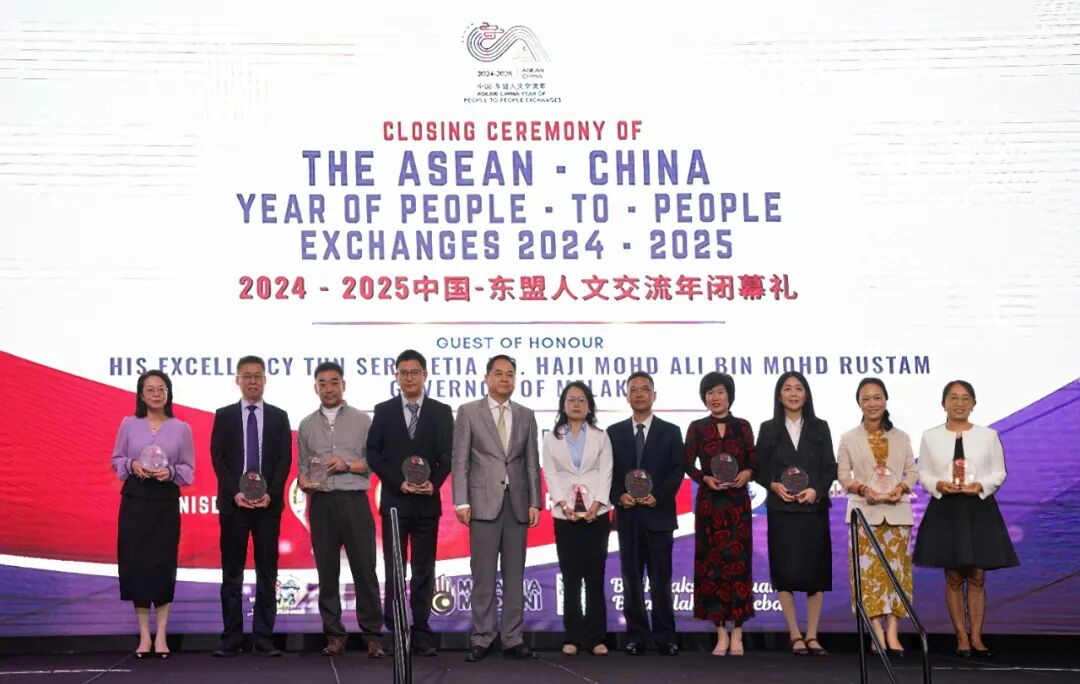 闭幕式上,杨万明会长和莫哈末元首分别为评选出的中国—东盟人文交流年十大项目和最佳组织奖授奖。其中,2024中国—东盟人文交流年开幕式、2024中国(河南)—东盟人文交流月、《花儿与少年·好友记》、江苏—东盟国家教育合作交流会、中国—东盟藤球邀请赛、2025面向东盟的妇女发展交流合作论坛、第十一届中国—东盟青年精英交流节、第三届中国—东盟创新创业大赛、2024中国—东盟周、中国—东盟国民体质与健康促进国际学术会议荣获交流年十大项目;国家广播电视总局、广西壮族自治区人民对外友好协会、贵州省外事办公室、中国—东盟中心、马来西亚—中国友好协会荣获交流年最佳组织奖。