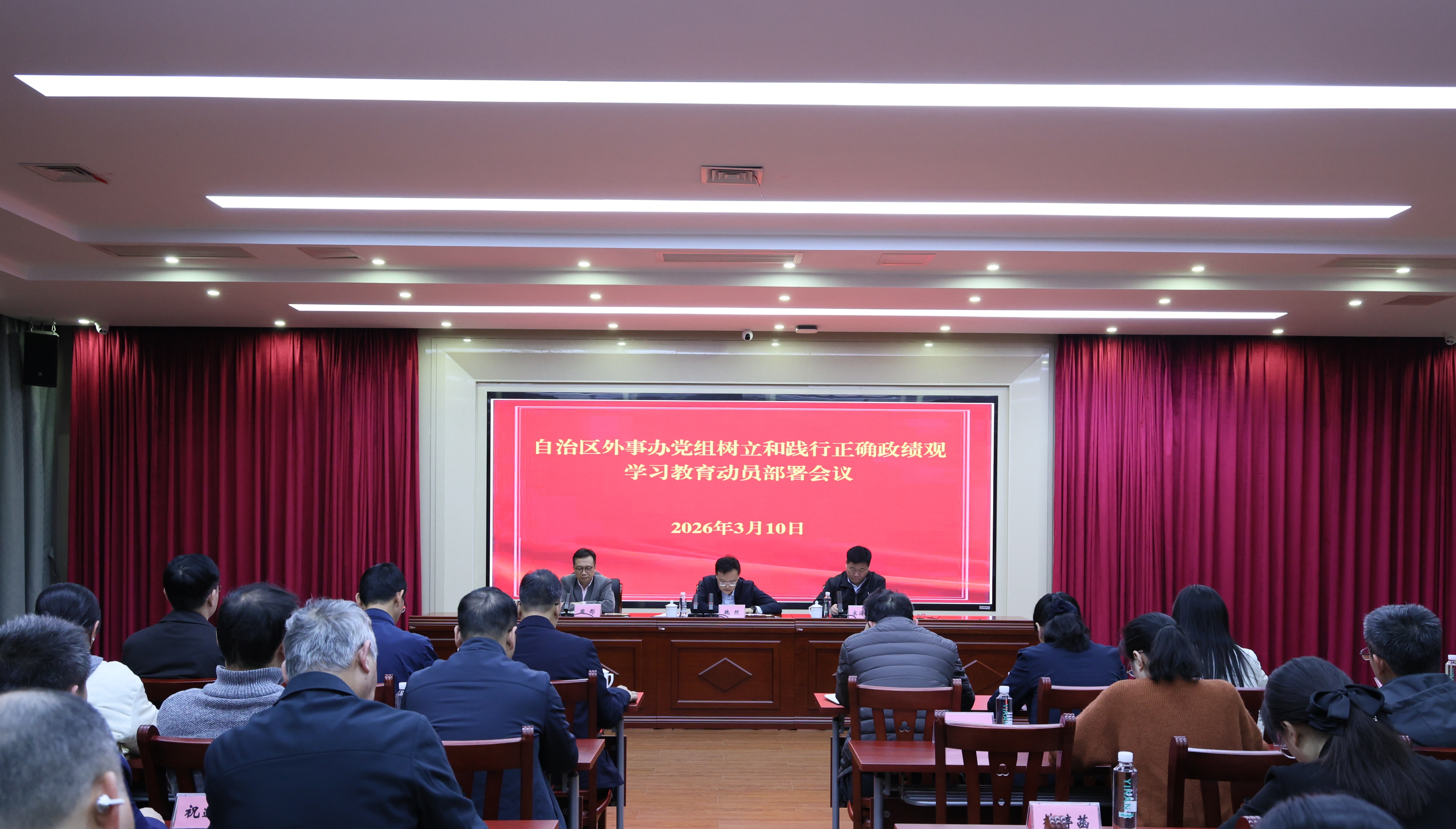 3月10日,自治区外事办党组书记、党的建设工作领导小组组长魏然主持召开领导小组会议暨自治区外事办党组树立和践行正确政绩观学习教育动员部署会议,传达学习习近平总书记关于树立和践行正确政绩观学习教育的重要讲话和重要指示精神,贯彻落实中央和自治区党委有关通知精神,审议有关文件,动员部署全办开展学习教育工作。
