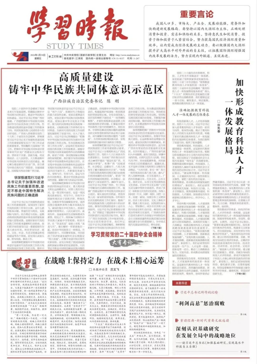 1月30日,《学习时报》头版刊发广西壮族自治区党委书记陈刚署名文章《高质量建设铸牢中华民族共同体意识示范区》,全文如下——